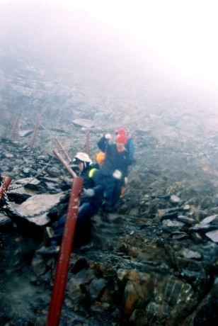 下山走到方才的碎石區時再回首,主峰山頂已經被雲霧籠罩不見身影。
