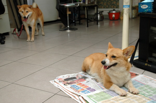 由於仟二習慣抬腿尿尿,為了好整理,我大費周章在牆上貼了一整排報紙,