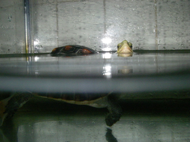 這張就對了!可不是隔玻璃拍的,而是讓鏡頭各一半在水上與水下,這次終於拍到小什的頭了,一臉茫然。