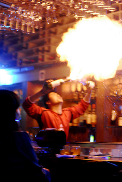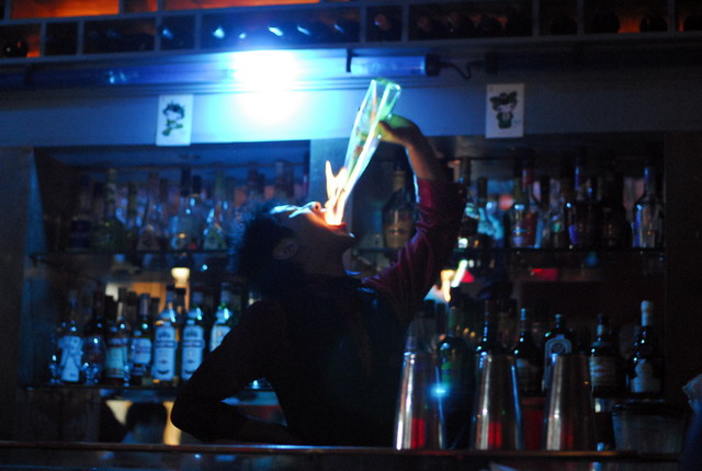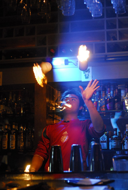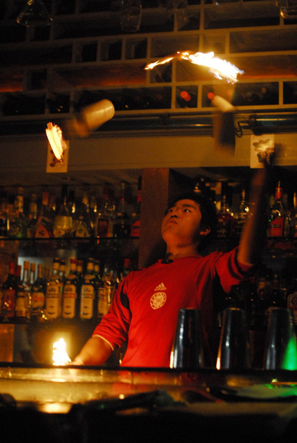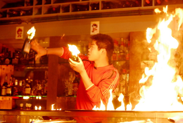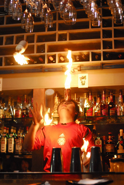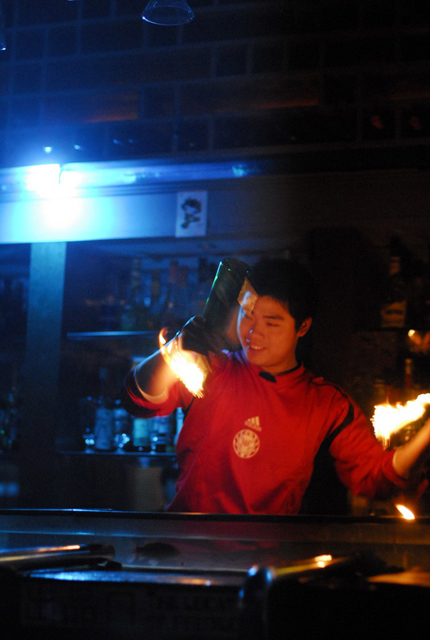 以下是吧台的調酒表演,蠻厲害的,又點火又一次丟4支酒瓶。不過看久了我們一致有個疑問:這不是調酒是雜耍吧!中途根本沒有倒酒動作,就是一直在耍特技...