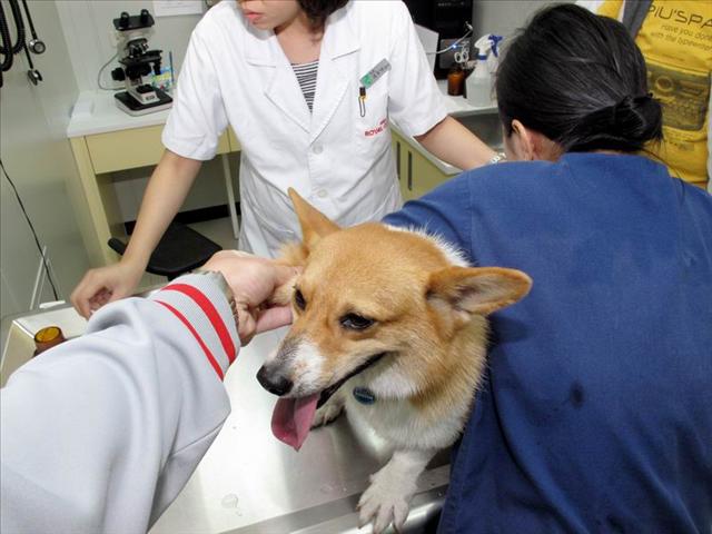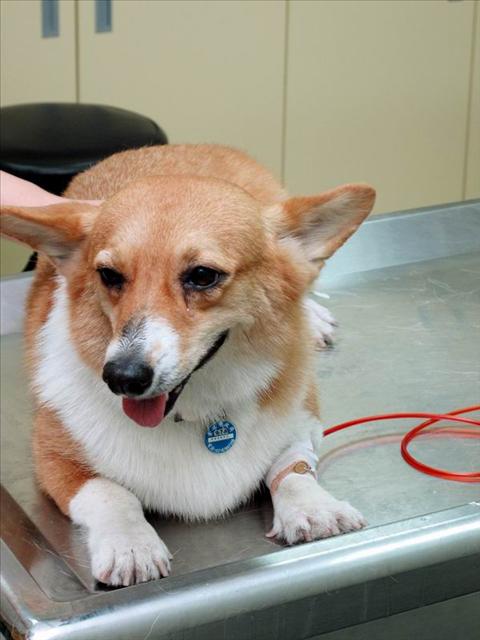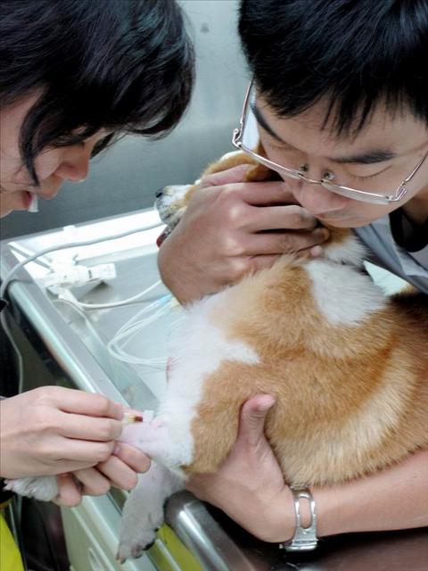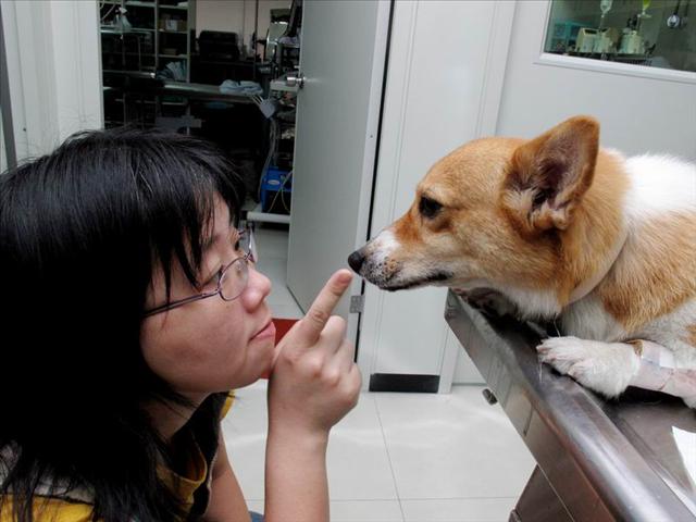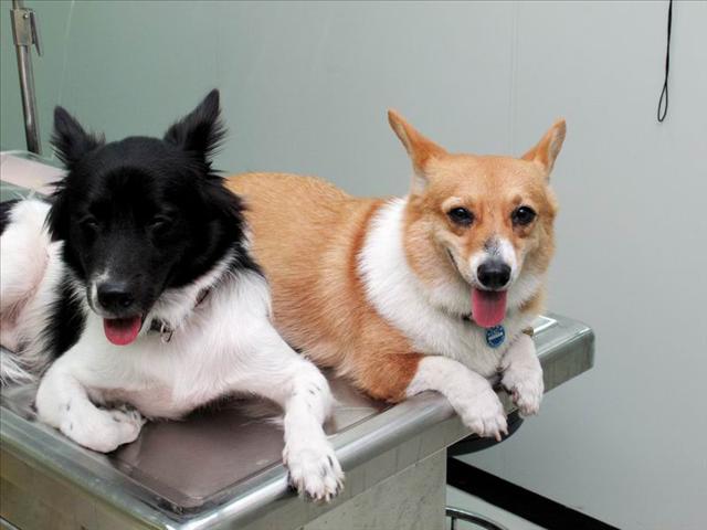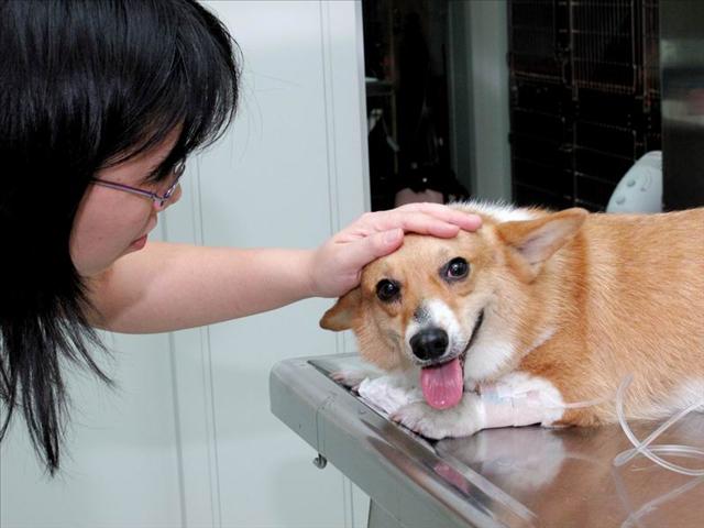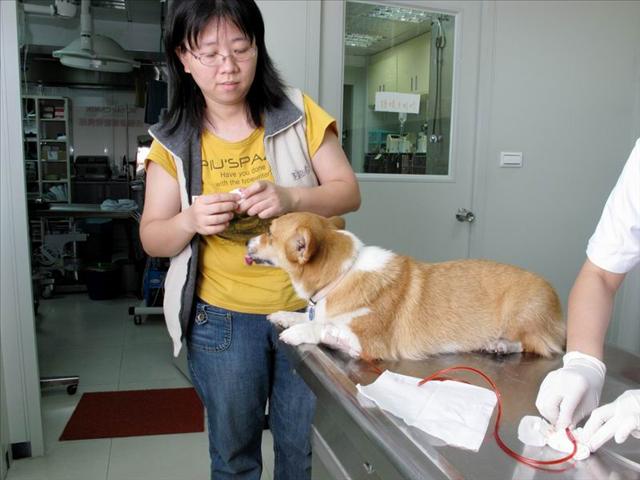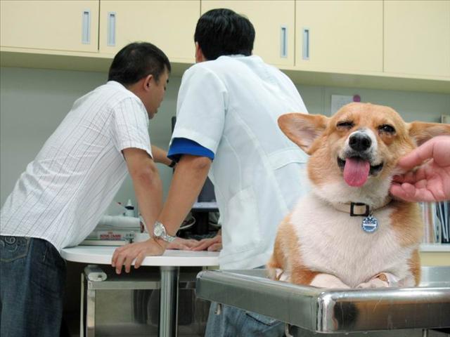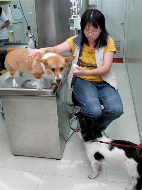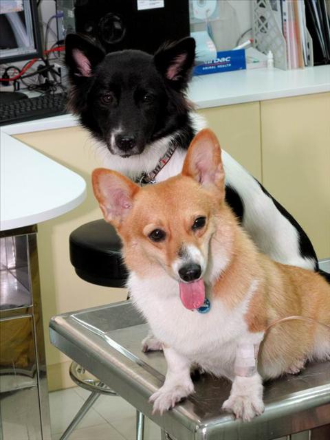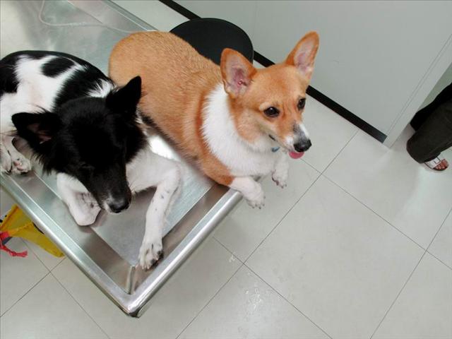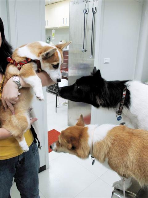 原來有一隻半成犬柯基來醫院打預防針,老姊把他抱進來跟多仔認識。