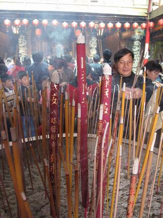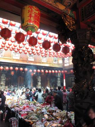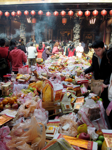 廟裡不僅人潮湧擠,桌上的供品也擺到快滿出來了。