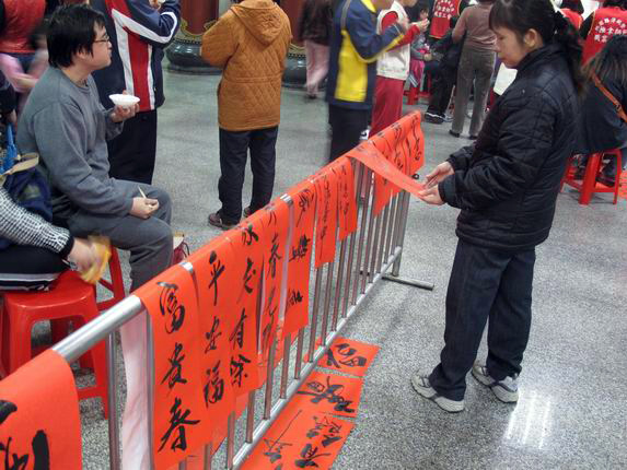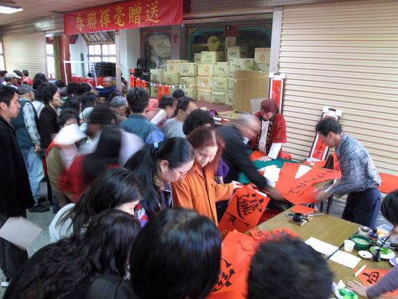 快過年了,廟方很貼心地找來近10位書法家,現場書寫讓民眾排隊索取。