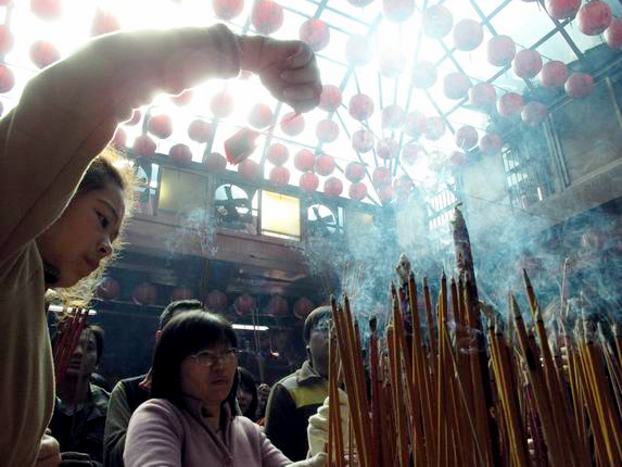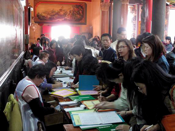眾人擠在這排桌前,為了幫全家人預約在廟裡點一盞光明燈。