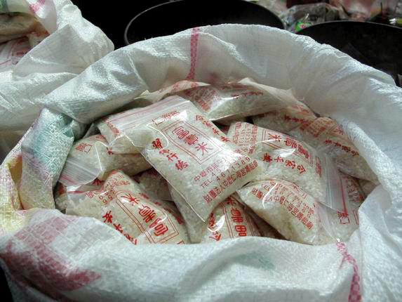 供桌上的富貴米分裝成眾多小包,讓香客隨意取用。