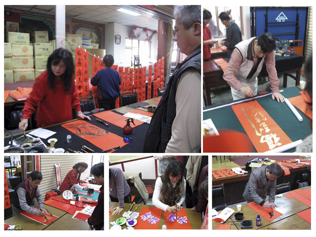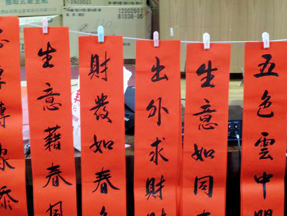 手寫春聯特點之一是拿到不能馬上捲起來帶走,得攤平讓墨水字跡晾乾。