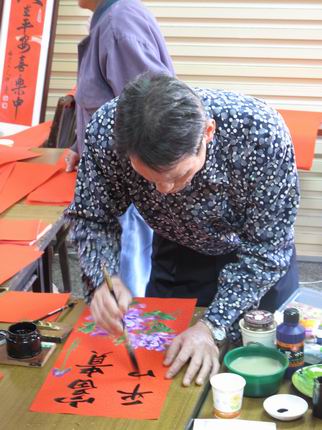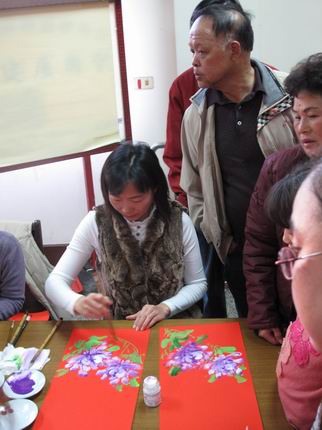 這群書法家以這攤最受民眾青睞。首先由兩名女子先在紅紙下方畫出色彩繽紛的牡丹花...